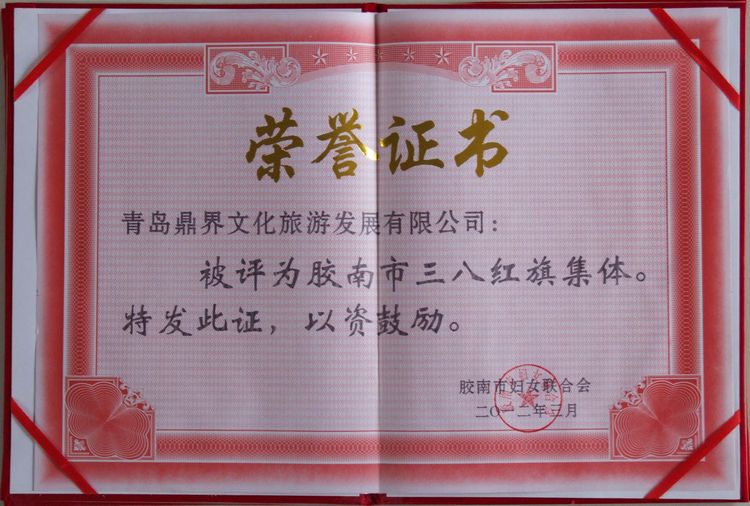 3月7日,全市紀(jì)念“三八”國(guó)際勞動(dòng)?jì)D女節(jié)102周年大會(huì)隆重召開(kāi)。大會(huì)授予青島鼎界文化旅游發(fā)展有限公司“全市婦女創(chuàng)先爭(zhēng)優(yōu)集體獎(jiǎng)”和“膠南市三八紅旗集體”榮譽(yù)稱(chēng)號(hào)。