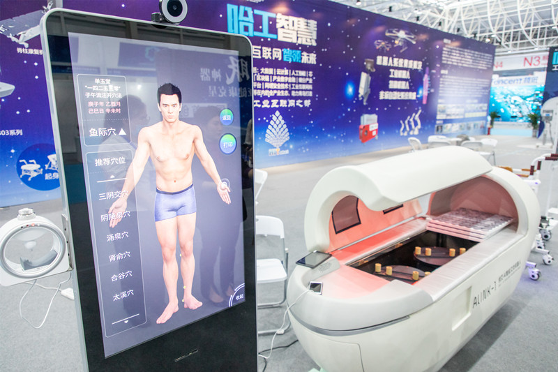 位于海工裝備與海洋科技展區(qū)內(nèi)的哈工大機(jī)器人集團(tuán)展位里,人氣頗旺。哈工(青島)機(jī)器人有限公司哈工智慧市場(chǎng)總監(jiān)劉瑛正一邊演示一邊為大家介紹哈工大最新研發(fā)的機(jī)器人?!拔覀冏灾餮邪l(fā)了這套中醫(yī)問診系統(tǒng),這款艾灸機(jī)器人能夠依托傳感技術(shù)進(jìn)行脈診,并通過圖像分析進(jìn)行面診、舌診,搭配體質(zhì)辯診問題庫,生成報(bào)告后傳輸?shù)皆贫诉M(jìn)行數(shù)據(jù)分析,會(huì)生成艾灸診療方案,機(jī)器人會(huì)根據(jù)方案通過點(diǎn)對(duì)點(diǎn)穴位為人體進(jìn)行調(diào)理。”