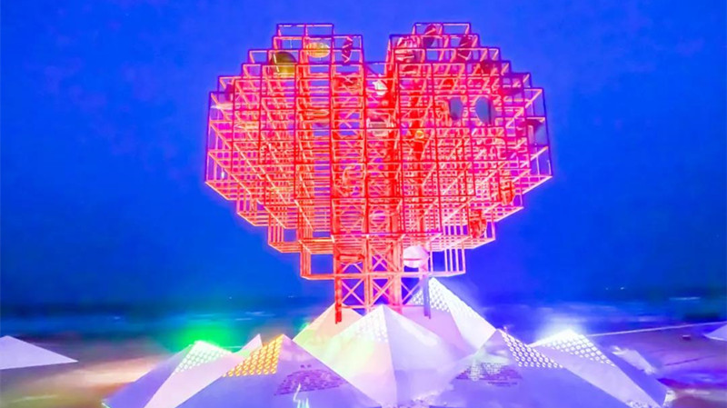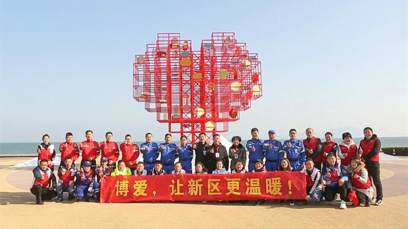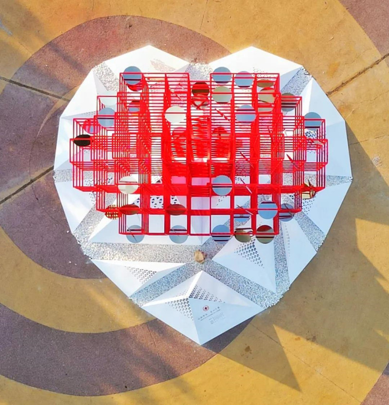 該雕塑位于城市陽臺景區(qū)原海螺廣場,距風(fēng)河入海口北岸約400米,背靠會展公園,與靈山島隔海相望。采用動態(tài)雕塑形式,主體結(jié)構(gòu)為愛心狀,內(nèi)部由一片片可以風(fēng)動的鏡面不銹鋼組成,猶如多顆“愛心”爭相簇?fù)?;從空中俯瞰,亦成“心”形,寓意“愛心匯聚”。側(cè)面呈紅十字狀,底座呈山形,與風(fēng)河、大海相呼應(yīng),象征“山海情深”。作品整體與環(huán)境相融,實(shí)現(xiàn)“山海情深、愛心匯聚”的詩意表達(dá),與紅十字“人道、博愛、奉獻(xiàn)”精神完美契合,展現(xiàn)了新區(qū)人民熱心公益、崇德向善的社會風(fēng)尚和勇立潮頭、積極向上的精神風(fēng)貌。