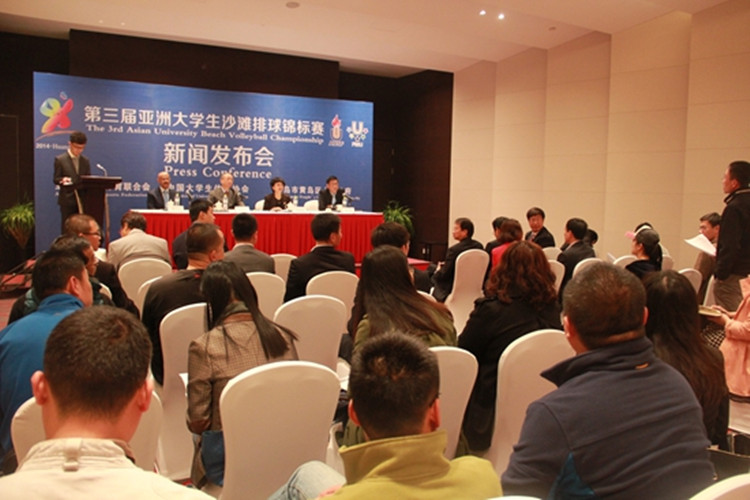 4月19日,2014年第三屆亞洲大學(xué)生沙灘排球錦標賽新聞發(fā)布會在青島靈山灣旅游度假區(qū)城市陽臺福朋喜來登大酒店舉行。隨后,亞大體聯(lián)全部常委實地查看了比賽場地。亞大體聯(lián)主席、教育部原副部長章新勝,亞大體聯(lián)第一副主席AL-HAI Omar A,亞大體聯(lián)副主席CHEN Kunning,亞大體聯(lián)秘書長CHOW Kenny,區(qū)領(lǐng)導(dǎo)孫大貴等出席。